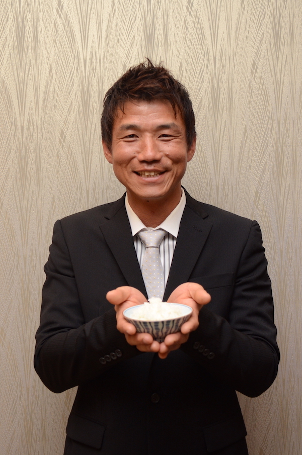 11月15日、福岡市でお披露目された株式会社オプティムの「スマート米」。会場には、福岡、大分、佐賀の3県で、ピンポイント農薬散布テクノロジーを駆使して行う「スマート米栽培」により、実際にお米を栽培した3人の生産者の姿がありました。